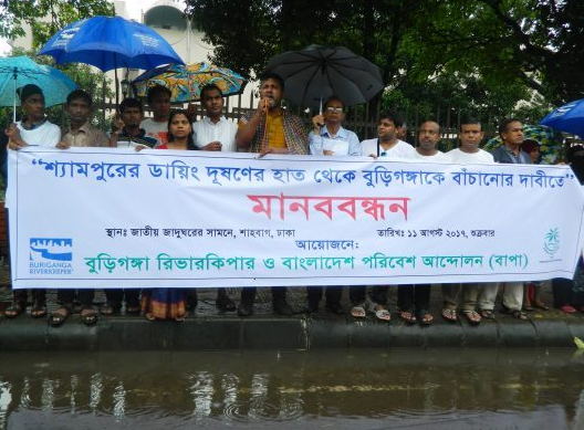 After Hazaribagh Tannery, the second largest deadly clustered pollution directly to the Buriganga has been generating from Shyampur dyeing industries. To stop this pollution, Bangladesh Poribesh Andolon (BAPA) and Buriganga Riverkeeper jointly organized a human chain demanding, ‘Save Buriganga from Shyampur’s Dyeing Pollution’ on 11th of August, 2017, at 10:30 AM in front of Bangladesh National Museum, Shahbagh, Dhaka. Despite the heavy rainfall in the morning, many organizations and activists, women and children, especially from Old Dhaka, protested along with BAPA and Buriganga Riverkeeper.